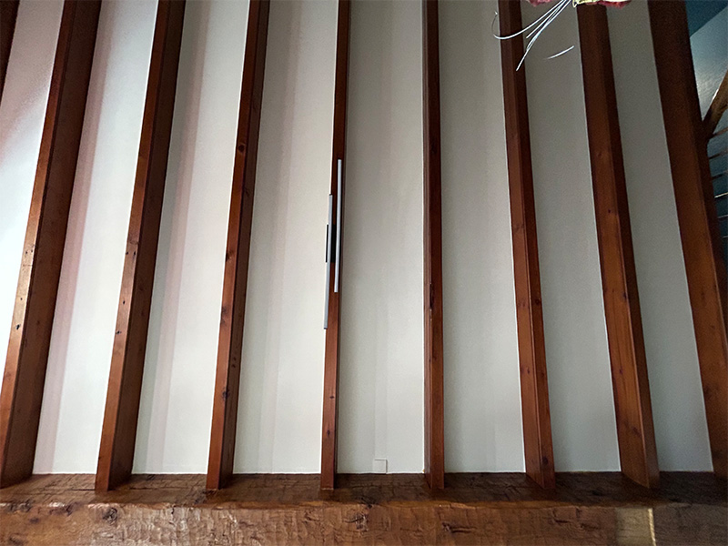 Pour garantir une finition impeccable et durable, nous avons posé une toile de verre sur l’ensemble du plafond, y compris les entres poutres. La toile de verre permet de masquer les imperfections du support et de créer une surface idéale pour l’application de la peinture.